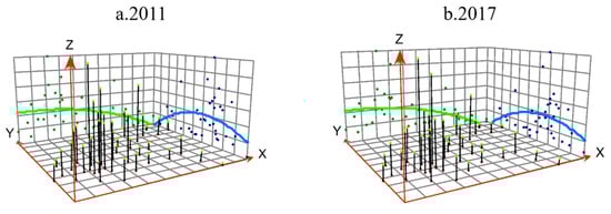 In order to further explore the spatial pattern and formation mechanism of ecological carrying capacity of county education, the development process of ecological carrying capacity of county education in Chongqing was revealed from the perspective of regional spatial gradient evolution. In this paper, the trend lines of transects in 2011 and 2017 were drawn and compared by using the spatial analysis method of the trend surface (Figure 5). In 2011 and 2017, the trend of ecological carrying capacity in Chongqing county had not changed much. On the whole, it was high in the west and low in the east, with an inverted U-shaped structure from north to south. The high value points were concentrated in the west and central areas of Chongqing, and the spatial directivity was more prominent. The metropolitan areas with developed urbanization had obvious educational advantages. Compared with 2011, the curve in 2017 was smoother, indicating that the gap of educational ecological carrying capacity had a trend to narrow.