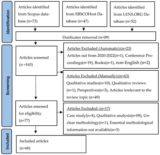 The “PRISMA flow diagram” requires the identified articles must be screened based on the inclusion criteria. The screening process included automatic screening using database options, manual screening by independent assessors, retrieval of bibliometric data from articles in an Excel file, manual assessment of each article’s methodological eligibility, and downloading the full versions of each screened article. Both in automatic and manual screening, the articles that did not meet the inclusion criteria were removed [48,49,50,51]. Figure 1 depicts the full article selection process, and Section 3.1 explains the number of excluded articles and their reasons.