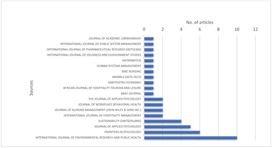 Table 1 provides some background information on the articles that were reviewed. Accordingly, the review included 60 articles published in 36 journals from 27 countries. There were 2721 references and 213 keywords, and their findings were used for the review. The annual article production is shown in Figure 2, revealing that the number of published articles has increased during the period. Figure 3 shows the sources of the articles. It summarizes the 20 journals that published the highest number of related articles out of 36 journals. Thus, the International Journal of Environmental Research and Public Health (10 articles), Frontiers in Psychology (six articles), and Journal of Applied Psychology (five articles) reported having the highest number of publications. Instead, Figure 4 shows countries that have produced articles on the current study’s area. It summarizes how each country is interdependent with the other. In particular, the nodes in the Figure 4 denotes the number of occurrences. Thus, Figure 4 reveals that the USA (11 articles), China (11 articles), Spain (five articles), and Germany (three articles) are leading in the number of publications.