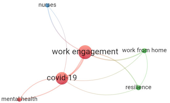 The keyword co-occurrence network visualization in Figure 5 shows the keyword by circles connecting each keyword. The circles’ size in the map denotes the number of occurrences. Thus, the higher the number of occurrences, the larger the circle’s size [50,51,60,61,63]. Accordingly, employee engagement and work engagement are denoted in larger circles. The rest of the keywords are denoted in circles depending on the frequency of their occurrences. Hence, the size of the circle in the visualization further confirms the information in Table 3. The circles in the map in Figure 5 are in three red, green, and blue clusters. Thus, each cluster includes keywords likely to represent the same topic [50,51,62,64]. Hence, as shown in Table 4, the red, green, and blue clusters reflect common themes such as “mental health risks of employees”, “social and organizational support”, and “resilience and work arrangements”, respectively, which are explained in detail as follows.