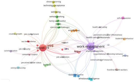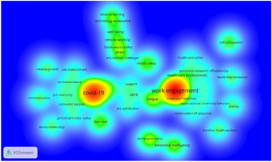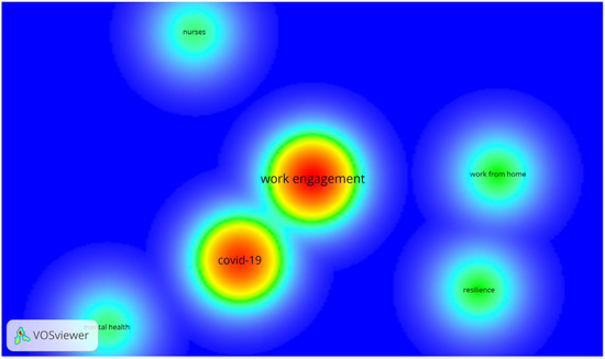 The density visualization map created by the VOSviewer (Figure 7) shows that more research is available on the keywords of employee engagement and COVID-19. Other than that, there is a shortage of studies regarding the other keywords on the map (Figure 7). It highlights that the circle points in the map are displayed in red background when there is more research on that area. Conversely, it is determined that the research is significantly less when a node in the map is denoted in the green background [61]. Thus, even though more research is available on employee engagement and COVID-19, there is a shortage of studies regarding keywords displayed in the green area. Therefore, more research is needed on the keywords in the green area.