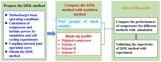 To clearly demonstrate the research idea of this study, an investigation procedure of the study is shown in Figure 1. Firstly, based on the basic conditions of turbocharger operation, since there was energy loss between the output power at the turbine end to the power consumption at the compressor end, the power transfer coefficient was proposed to characterize the bearing friction loss of the intermediate body. Then, based on the simulation and self-cycling experiments, the powers of turbine and compressor were calculated, and the coupling obtained the internal joint operation curve. Secondly, a compressor optimization method based on the internal joint operation law (IJOL) was proposed, and the blade number and blade tip profile were optimized. The optimization simulation results were compared with the traditional method. Finally, experiments were conducted to verify the results. Compared with the traditional method, the IJOL method was more reasonable and practical.