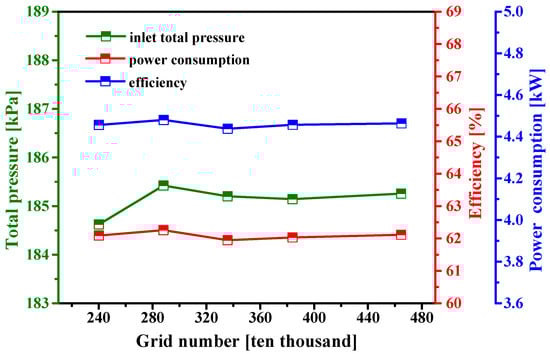 In order to validate the accuracy of numerical model, a mesh independence analysis was conducted. The total pressure, efficiency and power consumption of the compressor with different grid numbers are shown in Figure 5. It can be seen from the figure that the performance curve of the compressor was smoothly distributed and almost constant when the grid number reached above 3,358,000, so it could be considered that the grid number met the simulation requirements. Therefore, the grid number of 3,358,000 was chosen to use in the calculation.