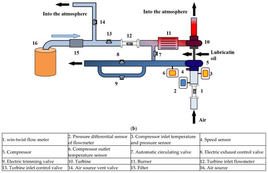 The compressor and turbine performance experiments were conducted on a Kratzer turbocharger test bench. Figure 6 shows the physical illustration and schematic diagram of the bench arrangement. The test bench was capable of measuring performance parameters of both the compressor and turbine, with automated data acquisition and processing functions. The bench could realize accurate control of turbocharger speed, compressor and turbine inlet and outlet parameters. The compressor inlet was equipped with a pressure and temperature regulator, which could be automatically adjusted in real time to ensure a smooth inlet temperature and pressure. Sensors were arranged in the turbine inlet and outlet pipes to improve the accuracy of temperature and pressure acquisition. The fuel for the experiment was liquefied petroleum gas, which could automatically correct the air-fuel ratio of the gas according to the turbine inlet temperature.