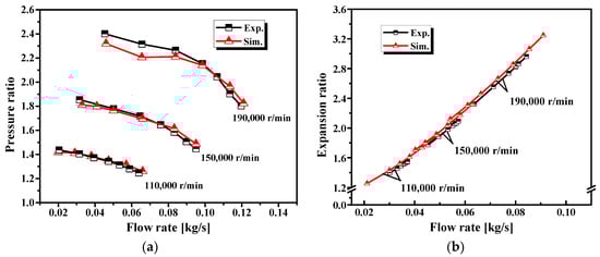 Figure 7 shows the turbocharger performances between the experiments and simulation. For pressure ratio of compressor, it can be seen that the maximum error was 4.71% at the high pressure ratio condition at 190,000 r/min, which was within the acceptable range. For expansion ratio of turbine, the experiment and simulation of the swallowing capacity were in good agreement with each other and had a maximum error value of 2.62% at the speed of 150,000 r/min, which was within the acceptable range. This discrepancy was attributed to the simplification of the secondary feature in the geometry, the optimal application scope of the SST model and manufacturing error [34,35]. Therefore, the turbocharger model could meet the simulation requirements and can be used for further study.