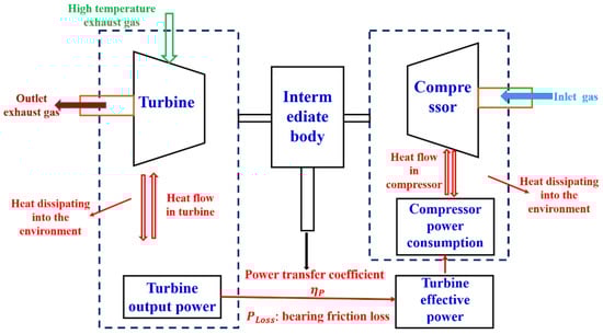 The heat losses at a turbocharger were heat dissipating into the environment, heat flows within the turbocharger as well as active cooling through cooling water and oil, all due to high temperature gradients. In the simulation, the heat loss dissipating into the environment was not considered, which was neglected. Due to the wall temperature in the simulation that was set as the compressor or turbine wall temperature under fixed boundary conditions (speed and flow rate) of the experiments, the heat loss from heat flow in the turbocharger was considered, and the heat loss was included in the turbine output power and compressor consumption power. This was because the turbocharger bench test was a hot blow experiment, and it can be seen from Figure 9 that the simulated values of the compressor and turbine efficiencies basically match the experimental values, indicating that the heat flows in the turbocharger had been considered in the simulation calculation.