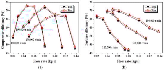 Comparison of simulated and tested turbocharger efficiencies. (a) Compressor; (b) Turbine.
