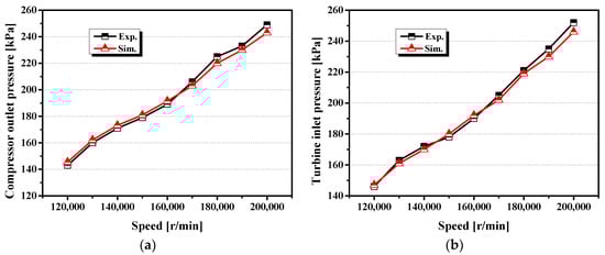 At the fixed speed, the turbine output power and the compressor power consumption were calculated by the simulation and turbocharger self-cycling experiments. Figure 10 shows the self-cycling experiment values of the compressor outlet pressure and turbine inlet pressure compared with the simulated values. As it can be seen that the self-cycling experiment values and simulation values were in good agreement, the error was in the allowable range.