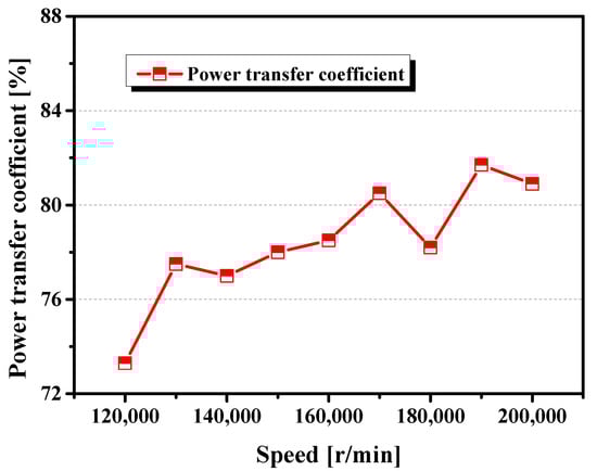 Based on the turbine output power and compressor power consumption calculated under the self-cycling experiment conditions, the power transfer coefficient is calculated by Equation (5), as shown in Figure 11.