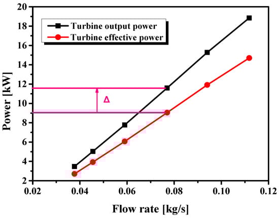The turbine effective power is the maximum power that can be obtained at the compressor end. The turbine effective power is obtained by transforming the turbine output power through Equation (5), as shown in Figure 12.