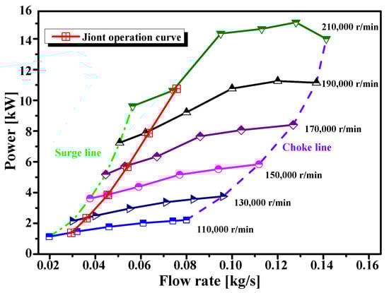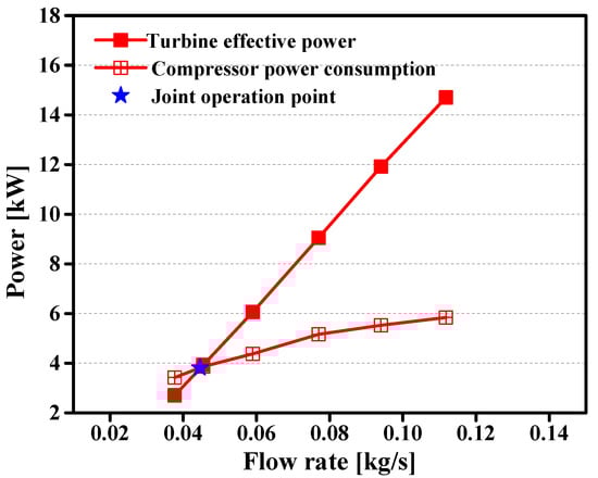 In the fixed-speed line, the compressor power consumption curve and turbine effective power curve were superimposed and coupled. The horizontal coordinate of intersection point of both the compressor and turbine at the time of coupling were the compressor working flow rate, and the intersection point of the power balance was obtained, as shown in Figure 13. The significance of the proposed joint operation point was to obtain a joint curve reflecting the turbocharger operation on the basis of considering the internal matching of the compressor and turbine.