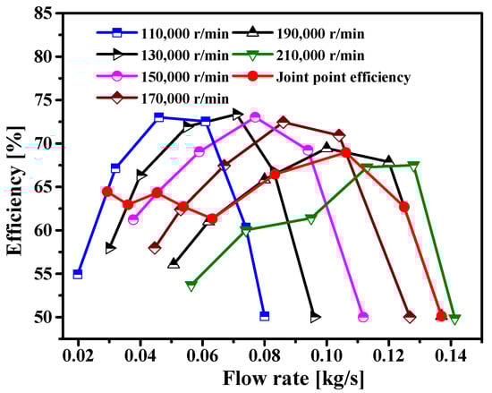 Figure 15 shows the distribution of compressor efficiency for the joint operating conditions on the compressor efficiency MAP. It can be seen from the figure that the efficiency of the joint point operating condition did not go through the maximum efficiency point of the compressor. Therefore, the efficiency of the compressor calculated based on the joint operating point was related to the speed and compressor working flow rate, synchronized with the turbine operating condition, and closed to the actual situation of the turbocharger, which was practical.