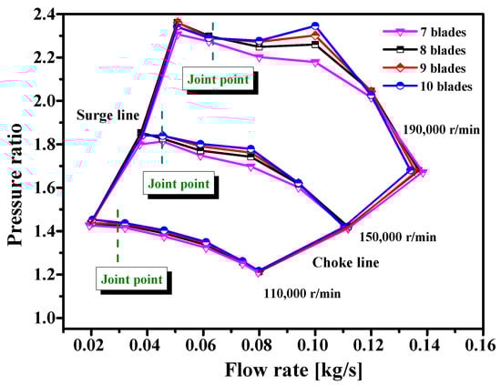 Figure 16 shows the effect of the blade number on the pressure ratio at different speeds. It can be seen that the pressure ratio increased with an increase in the blade number. When the blade number was greater than 8, the increased amplitude of the pressure ratio was limited. At 190,000 r/min, the difference between the outlet pressures of a 7-blade compressor and an 8-blade compressor were more than 4.5 kPa. Further observation found that the overall surge line of the four groups of blades was relatively close, but the choke line moved to the left with an increase in the blade number. With an increase in the blade number, the working flow range of the compressor became narrower. Specifically, at low and medium speeds, with the blade number increased, the surge flow slightly increased and the joint point surge margin gradually decreased. At high speed, there was no significant difference in the surge flow and surge margin for different blade numbers (as shown in Table 3).