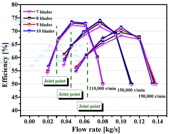 Figure 17 shows the effect of the blade number on the efficiency. It can be seen that near the joint point, the more the blade number, the higher was the efficiency. However, the difference was not obvious; the design point efficiency of the 10-blade compressor was about 1% higher than the design point efficiency of the 8-blade compressor. The 7-blade compressor’s joint point efficiency decreased significantly compared with other blade numbers, especially in high speed. As can be seen in Table 4, for the compressor performance index, an 8-blade compressor was the highest, while the 7-blade compressor performance index decreased more, indicating that the 8-blade compressor had the best performance and high comprehensive performance at the joint point.