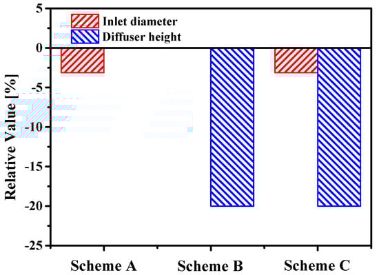 In summary, Scheme A was the best blade tip profile in the operating conditions range. Therefore, when the impeller inlet diameter was reduced by 3.12% and diffuser height remained unchanged, the overall performance of the compressor was higher than that of the original compressor, especially in terms of surge performance and joint point efficiency.