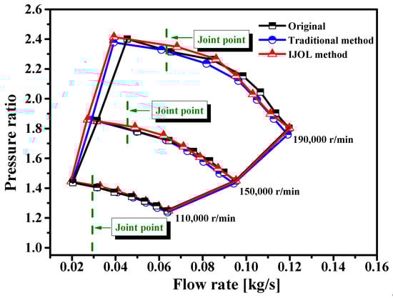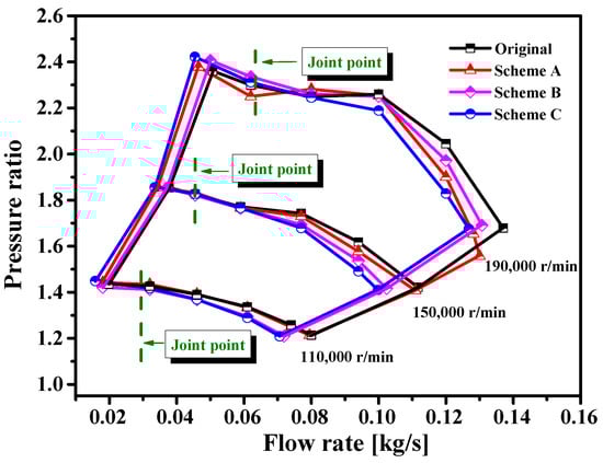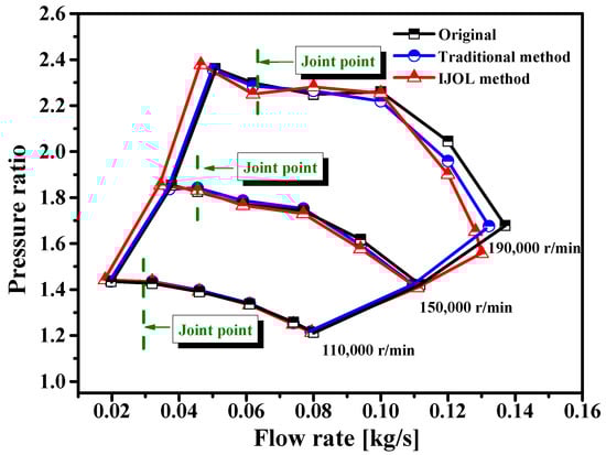 A comparison of the pressure ratio of the three structures is shown in Figure 21. It can be seen that the surge line of the traditional method moved to the left compared with the original compressor, but the leftward shift of its surge line was not as large as that of the IJOL method. The specific values are shown in Table 7. The lower the speed, the smaller was the surge margin of the traditional method, while the surge line of the IJOL method basically moved to the left as a whole, among which the improvement of the surge margin at low speed was obvious. At the joint points of low and middle speeds, the pressure ratio of the traditional method was not significantly different from that of the original compressor. While at 190,000 r/min, its pressure ratio was lower than that of the original compressor, which was especially obvious at high speed and high flow rate.