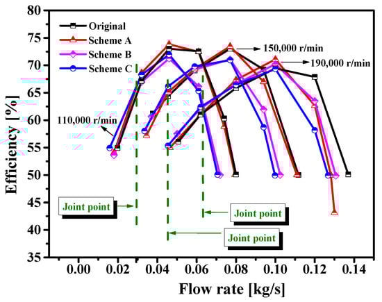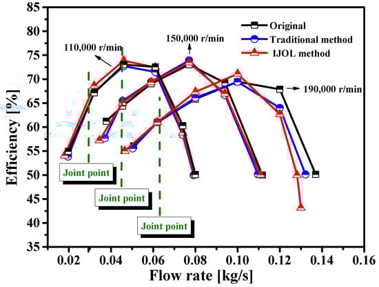 For the traditional method, the optimization goal is to pursue the maximum efficiency of the compressor [41,42]. Therefore, the index for evaluating the optimization results of traditional methods is the maximum efficiency. In order to compare the IJOL method with the traditional method, the original impeller structure, the splitter-blade impeller designed by the traditional method and the structure determined by the IJOL method with the impeller inlet diameter reduced by 3.12% were selected for comparison. The inlet and outlet diameters of the compressor impeller optimized based on the traditional method were the same as those of the original compressor. The numbers of main blades and splitter blades were each 5. In addition, the main blade was 3.5 mm higher than the splitter blade at the inlet guide vane, and the radial parts of the main and splitter blades had the same 3D shape. The main blade shape remained the same as the original compressor blade.