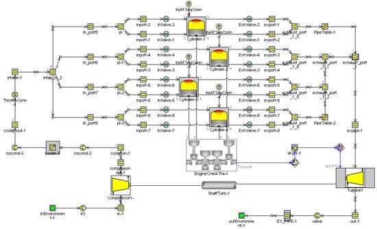 The optimal compressor structures based on the traditional method and the IJOL method were the splitter-blade impeller and the impeller inlet diameter reduced by 3.12% structures. A 1D engine model in Figure 23 was constructed using GT-Power for engine performance simulation and analysis. The basic assumptions [43] in this simulation are as follows: