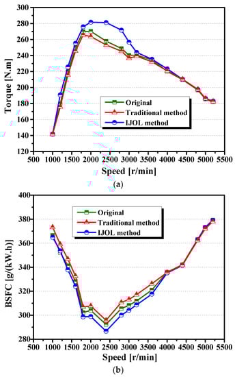As can be seen in Figure 24, the IJOL method had the highest overall torque and the lowest brake-specific fuel consumption (BSFC) at low and medium engine speeds, while the traditional method was the opposite. Compared with the original engine, the maximum torque of the IJOL method was 4.2% higher and the minimum BSFC was 3.1% lower, while the maximum torque of the traditional method was 2.4% lower and the minimum BSFC was 1.2% higher than that of the original engine. The reason was that the performance index of the IJOL method was highest in the three compressor structures, while the performance index of the traditional method was smallest. The better overall performance of the compressor could further increase engine torque and reduce BSFC [44]. Therefore, the impeller inlet diameter that was reduced by 3.12% designed by the IJOL method instead of the original impeller could improve the power and fuel economy of the engine at low and medium speeds.