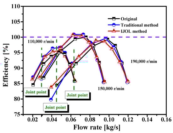 The efficiency comparison of the three structures is shown in Figure 22. Near the joint point of 150,000 r/min, the efficiency of the traditional method was the same as the original compressor, while at other speed joint points the efficiency of the traditional method was lower than that of the original compressor. The efficiency of the IJOL method was higher than that of the original compressor at all joint points. As can be seen in Table 8, the performance index of the traditional method was lower than that of the original compressor, while the performance index of the IJOL method had obvious advantages and was the best performance structure in the operating conditions.