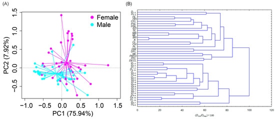The first two principal components (eigenvalue: ≥1) were extracted from the principal component analyses of the 42 morphological characteristic variables of male and female individuals, which explained 83.63% of the variance (Table 2). The BL, the D1–3, the D2–3, the D4–5, the D5–6, the D7–10, the HL, the PSL, the DSL, and the DFCL had high positive loading coefficients in PC1 (explaining 76.90% of the variance), representing the body shape and growth factors. The condition factor K had the highest positive loading coefficient in PC2, explaining 6.73% of the variance in Table 2, describing the body fatness factor. The morphological features of male and female H. labeo overlapped considerably (Figure 2A), even though male and female H. labeo were significantly different in terms of morphological characteristics (PERMANOVA, F = 8.316, p = 0.010).