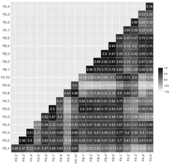 Some results that may be useful for comparisons in FL studies pertain to the OECD, according to whom the minimum average score for FL is 0.6 (60% of answers), approximately 0.71 for FK (71%), 0.6 for FB (or 60%), and 0.6 for FA (or 60%) []. Moreover, the S&P Global survey reports a score of around 60% for the most developed economies, while for emerging countries the score barely passed the 50% threshold [].