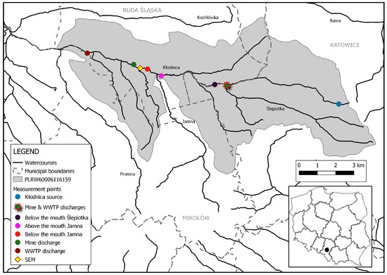 The location of the measurement points was selected to assess the potential impact of the identified contaminant sources, such as mine water discharges (coal mine “Wujek”—point no. 2—and Halemba—point no. 6) and wastewater discharges (wastewater treatment plant “Panewniki”—point 2—and “Halemba Centrum”—point no. 7). The location of representative control-point for operational monitoring corresponds to measurement point no. 5 (The Kłodnica river below the mouth of the Jamna stream) within which measurements were conducted in the study. The location of measurement points is presented in the following figure (Figure 1).