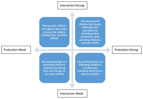 In addition, previous studies from the perspective of environmental behavior have concluded that the roles adults assume when accompanying children in outdoor play can be divided into two basic types: partners and guardians [2,3]. When acting as play partners, adults participate in children’s play and interact intensely with them to promote various types of play. When acting as guardians, adults do not frequently communicate with children, but limit their extraordinary activities to prevent harm. It can be observed that the role of play partners emphasizes interaction, while guardians focus more on protection. Therefore, based on the different emphases of adults’ accompanying behavior during children’s outdoor play, four basic modes can be identified: PSIS, PSIW, PWIS, and PWIW. The division and description of each mode are shown in Figure 1.