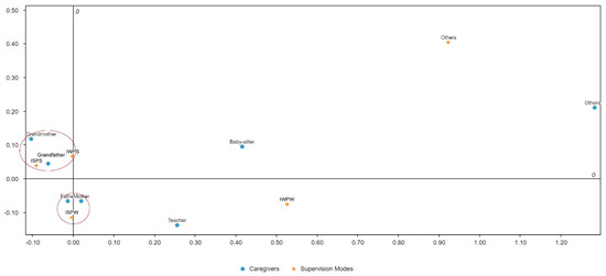 Correspondence analysis of relations between caregivers and accompanying modes.