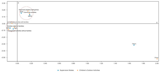 Correspondence analysis of relations between accompanying modes and children’s activities.