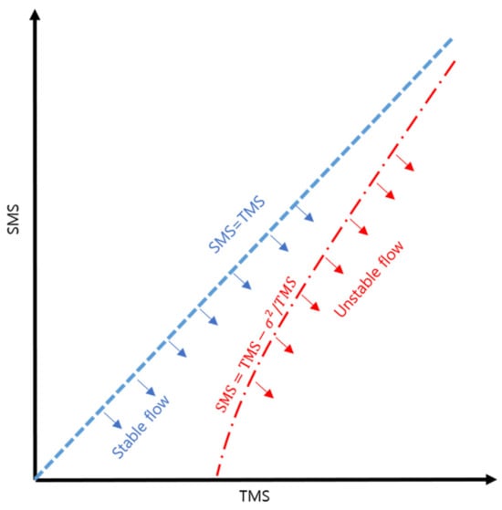 SMS and TMS are equal if all vehicles in the same space have the same speed. However, divergent individual vehicle speeds introduce discernible differentials between these two means, as illustrated in Figure 1. The relationship between these mean speeds is mathematically expressed in Equation (1). Employing the ratio of the square of TMS speed’s standard deviation to TMS itself offers an effective measure to quantify the dissimilarity between these mean speeds. This quantification is particularly informative when speed variations are uniformly spread across a designated space. In such instances, the extent of speed variability among vehicles may fluctuate, as dictated by the variance denoted as . Notably, the range of Speed Fluctuation (SF) per speed resides within the confines defined by the function of the two mean speeds, as described by Equation (2). This depiction is graphically elucidated in Figure 2.