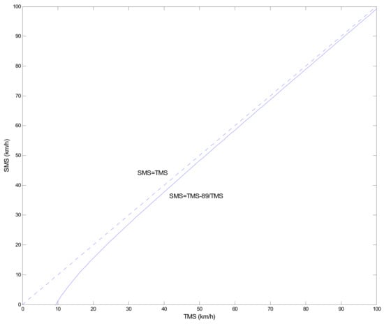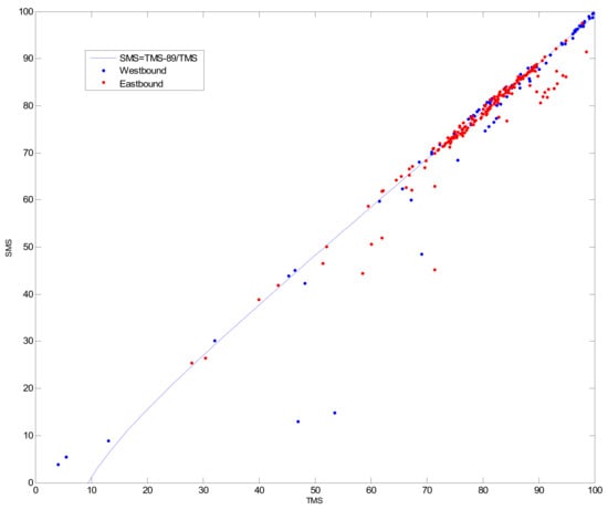 The central aim of this study was to create dynamic homogeneous speed zones from DTG data and to use them to facilitate the generation of speed information pertinent to micro-segments. These homogeneous speed zones were determined by comparing TMS and SMS. Typically, drivers are presented with an average speed for a designated segment, which is further partitioned into TMS and SMS. TMS and SMS represent, respectively, the arithmetic mean of vehicle speeds traversing a point or small road segment within a specified timeframe, and the quotient of speed by the distance covered by all vehicles transiting a road segment during the same period [8]. Usually, TMS is lower than SMS and both would be equal if all vehicles within a segment maintained an identical pace. Thus, the similarity between TMS and SMS serves as a metric for assessing the uniformity of vehicle speeds within a given segment. The present study evaluates TMS-SMS congruence based on the correlation between the two speeds. Past research has drawn upon empirical analyses to elucidate the relationship between TMS and SMS in the context of vehicles on expressways or national highways [22]. Garber [23] established an empirical linear linkage between TMS and SMS within expressway settings. Leong [24] also determined a linear relationship between these two speeds on a Malaysian national highway.