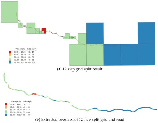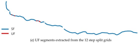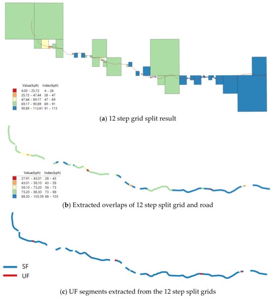The outcome of the 12-step grid partitioning of the Gyeonggi region along Expressway no. 50, as executed using the geohash algorithm with DTG data, is visually presented in Figure 7. If it is located above the standard deviation relationship curve between SMS and TMS, it is classified as SF, and if it is located below, it is classified as UF and the space is separated repeatedly.