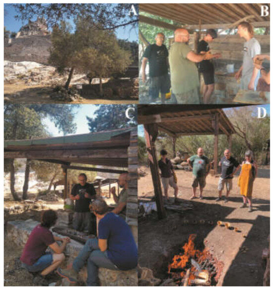 (A): View of the archaeological site of San Silvestro with the experimental facility under the castle. (B): Potters explaining their craft to the public. (C): Potters engaging with the park’s staff. (D): Potters and archaeologist setting up the experimental firing.