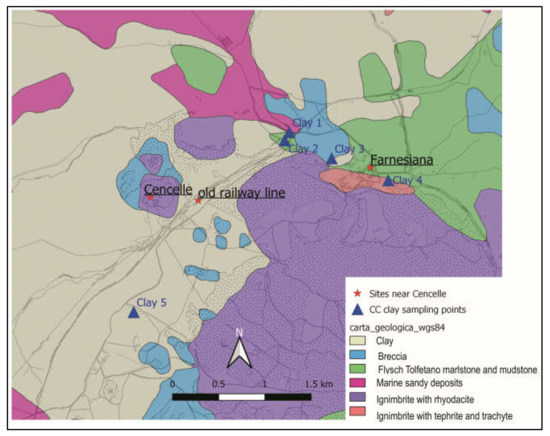 Map of the clay sampling locations, made with the data available at https://geoportale.regione.lazio.it/layers/geonode:carta_geologica_wgs84 accessed on 10 September 2023. Licensed under BY 4.0 (CC).