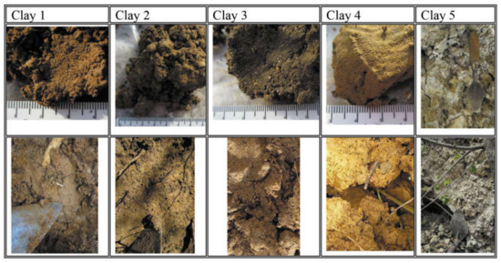 The five potential clay sources identified are in the ‘Farnesiana’ area, known to be the location of one of the stone quarries that supplied Cencelle [35] (pp. 97–98). Based on this knowledge, a walking survey started at the site of Farnesiana (Figure 2) and moved west, stopping at points identified as geologically compatible with the characterised volcanic Petrographic Fabrics 1 and 3 (Table 1). Four red clays with volcanic inclusions were collected (Clays 1, 2, 3, 4; Figure 3). The targeted bibliographical search also identified a kaolin clay deposit (white clay) consistent with archaeological samples (Petrographic Fabric 2; Table 1) on the hill named Ripa Majala in front of Cencelle [39] (p. 45), [40] (p. 37), [36] (pp. 59–66). This clay was not registered on the geological map, but the evidence obtained from the literature led to a deposit of white kaolinitic Clay 5 (Figure 3).