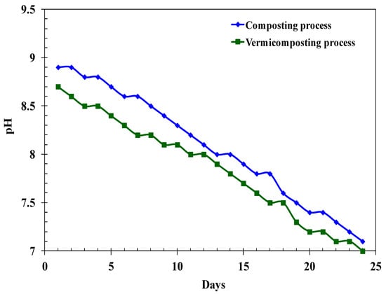 pH variation in compost and vermicompost of agro-residues with DBS over experiment period is shown in Figure 1. The compost and vermicompost from agro-residues showed a change in pH that falls in the range of 8.82 ± 0.06, 8.68 ± 0.03 and 7.2 ± 0.05, 6.94 ± 0.03, respectively, which is within the optimal range for plant growth [29]. This shows a shift of pH towards neutral condition (Figure 1). The decrease in pH value is greater in the case of vermicomposting compared to the composting process. Several researchers have reported analogous findings during the vermicomposting process. They propose that the mineralization of nitrogen (N) and phosphorus (P) into nitrites/nitrates and orthophosphates, combined with the bioconversion of intricate materials into intermediary organic acid species and the subsequent release of CO2, could be the factors responsible for the observed pH reduction [30]. Khatua et al. [31] proposed that the decomposition of organic matter during vermicomposting of banana stem waste having high K, Mg, and Fe using E. fetida had high nutrient levels. Rastogi et al. [32] demonstrated that microbes become additives for the reduction in solid waste in the composting process.