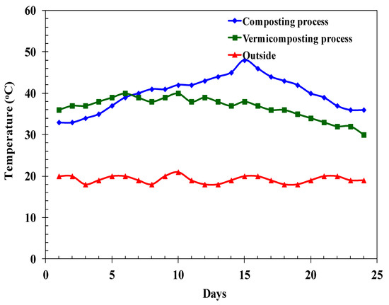 Temperature of the reactor over the period of composting and vermicomposting. (E. fetida) (125 animals/L).