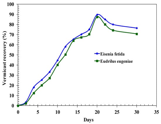 The fluctuation in vermicast recovery over time is illustrated in Figure 5. Peak recovery was attained in 20 days, registering at approximately 90% for E. fetida and 84% for E. eugeniae. Subsequent to this peak, a slight decline in recovery was noted. Comparable observations were made by Ganesh et al. [16]. A couple of factors are believed to influence the rate of vermicomposting recovery. Firstly, there’s an acceleration factor: as worms become more familiar with their feed, they tend to consume larger amounts of the composted matter. Secondly, as worms grow in size, their consumption rate increases, leading them to feed more aggressively. The culmination of these factors propels vermicast production to its zenith. Following this peak, however, there was a noticeable drop in vermicast recovery. This decline can be attributed to the natural life cycle where older worms die off and younger ones are still in the process of maturing. In a separate study, Pathma and Sakthivel [37] delved into the microbial diversity of vermicompost bacteria in relation to agricultural characteristics. Drawing from the findings of Ananthavalli et al. [26], it is evident that the worm species Perionyx excavatus is adept at transforming a blend of seaweed and cow dung into nutrient-dense vermicompost.