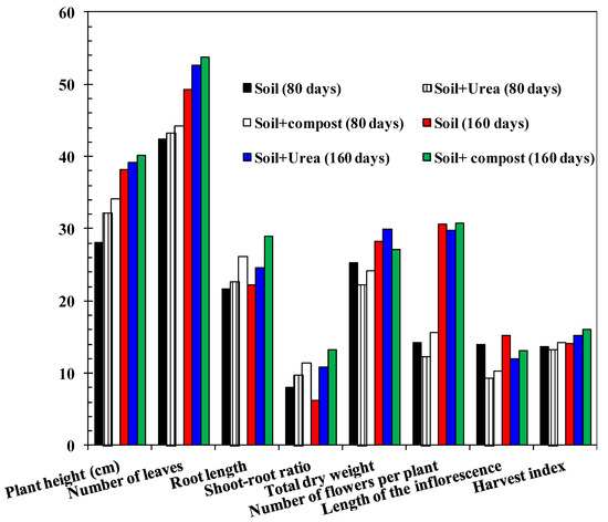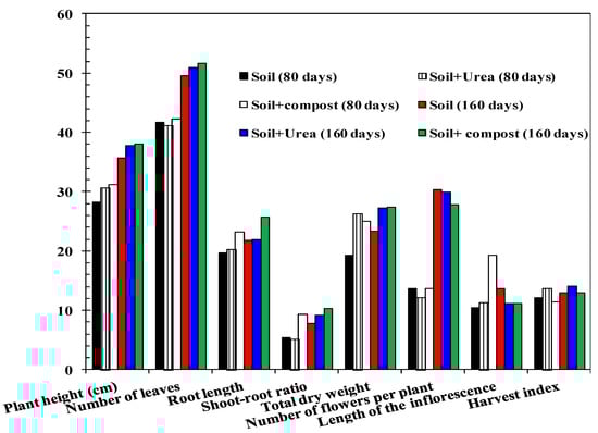 Effect of the application of compost on the growth of brinjal plant as composted agricultural residue (all height and length are in centimeters and weight is in gram). SEM = 1.23; p-value of compost X Control Interaction = 0.22. Least squares mean lacking a common letter differ (p < 0.05).