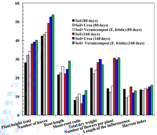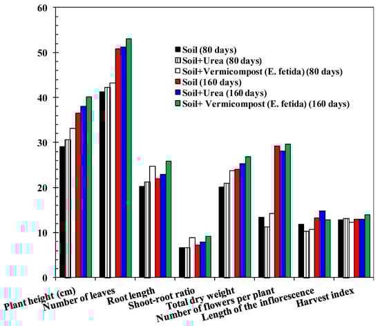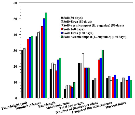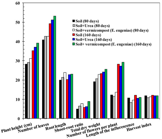 The experimental results regarding the growth of chili and brinjal plants with the use of compost and vermicompost are presented here. In the initial three months, when the control pot received no compost–vermicompost treatment, pots that were supplemented with these organic materials exhibited enhanced growth. This was evident in both chili and brinjal plants, as they displayed marked improvements in height, root length, biomass accumulation rate, earlier flowering, and increased fruit yield. Figure 6, Figure 7, Figure 8, Figure 9, Figure 10 and Figure 11 illustrate the growth study of chili and brinjal plants when treated with compost–vermicompost derived from agricultural residues. Vermicompost, when compared to traditional compost, fostered superior growth in chili and brinjal plants, especially in metrics such as plant height and leaf count. When comparing the effects of two different worm species, E. fetida emerged as the more beneficial species. Aynehband et al. [39] found that vermicompost sourced from crop residues presented a more favorable biological environment than those produced from manure or the direct application of crop residues. Ewulo et al. [40] observed analogous results when studying cow dung manure’s impact on soil, leaf nutrients, and pepper yield. Beyond just plant growth, Suthar [41] showcased the enhancement of product value via bioconversion of crop residues and cattle shed manure using the earthworm Eudrilus eugeniae. Ananthavalli et al. [26] examined the growth and reproduction of Perionyx excavatus in a mix of seaweed and cow dung through the vermicomposting process. Their findings highlighted a significant conversion rate or growth acceleration of Perionyx excavates.