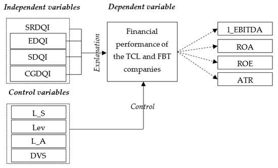 To characterize the financial performance of FBT and TCL companies, a number of dependent variables were used that relate to three main aspects of such performance—earnings (earnings before interest, taxes, depreciation and amortization (EBITDA)), profitability (return on Assets (ROA), return on equity (ROE)), and productivity (assets turnover ratio (ATO)). Based on the findings of Xu and Wang [35], this study also uses the logged value of EBITDA. The financial performance measures used in the paper are quite often used by scholars in similar studies [4,28,29,30,31,32,33] and are defined as accounting-based measures derived from accounting calculations.