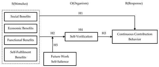 The focus of previous research has been on the influence of factors like material incentives [12], user trust [13], user reciprocity [13,14], and self-presentation [15,16] on users’ continuous contribution behavior, but the mechanisms underlying this influence and its effects have not been discussed. According to the Stimulus–Organism–Response (S-O-R) theory, users’ continuous contribution behavior is a response to the stimuli they experience from the perception of benefits. Studies have embedded the mechanism of user benefits on continuous contribution behavior into the S-O-R theory. However, most scholars regard user benefits as a component of the organism (O), reflecting the interaction process between external stimuli and user contribution behavior [17]. In an open innovation community scenario, user benefits, as the stimulus (S), can stimulate their intrinsic perceptions, prompting users to influence the output of subsequent behaviors through self-verification. Therefore, this study uses the S-O-R theory as the main framework to explore the influence of user benefits as a stimulus component on continuous contribution behavior. On this basis, this study tests the mediating role played by self-verification, which represents intrinsic organismal perception.
