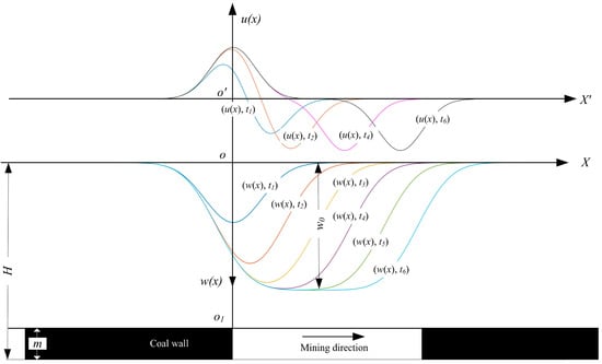 Surface deformation, resulting from underground mining, constitutes a complex and ongoing dynamic process that unfolds over time and space [13,14,15,16,17]. Figure 1 illustrates the subsidence w(x) and horizontal deformation u(x) of surface points on the strike main section at various times as the working face progresses. Researchers worldwide have extensively investigated this phenomenon, proposing various time functions and theories to predict surface dynamic subsidence. These functions encompass the Knothe time function, the Richards time function (which generalizes numerous well-known growth equations, including Knothe [18,19]), the generalized time function, and the normal distribution time function. In China, the Knothe time function is widely utilized for dynamic mining subsidence prediction and has been extensively examined and improved upon by numerous scholars. For example, Cui et al. [20] developed a method for determining the influence coefficient of the time function and derived a probability integral dynamic prediction formula based on the Knothe time function. Wang et al. [21] introduced a time parameter into the Knothe time function model, enabling the modeling of surface subsidence during mining with overburden grout injection. Hu et al. [22] proposed a dynamic subsidence prediction model based on Knothe’s dynamic subsidence hypothesis and Litwiniszyn’s stochastic medium theory for constant advancing speed mining and post-mining conditions. Zhang et al. [23] improved the Knothe time function to enhance prediction accuracy. However, despite the accurate fitting of the Knothe series models, they have limitations in describing the complete process of surface point subsidence. Chang et al. [24] proposed a segmented Knothe time function to address these limitations and validated its application. Subsequently, Zhang et al. [17] further enhanced the segmented Knothe time function to improve prediction accuracy. Nevertheless, an ideal time function should have high accuracy and reflect the spatiotemporal distribution characteristics of surface subsidence, such as the symmetry or asymmetry of subsidence velocity and acceleration, and the consistency of the turning point time in dynamic processes. The time functions proposed by these scholars have all demonstrated excellent validation accuracy. However, they do not take into account the time nodes when calculating model parameters. This can lead to potential discrepancies between the model-calculated time nodes for maximum speed and maximum acceleration and the actual observations. Moreover, most of the time functions employed in previous studies primarily focus on the dynamic subsidence of individual points on the surface of the mining area, thereby overlooking the comprehensive characteristics of the entire surface deformation process. This approach results in a less systematic representation of the actual deformation law and fails to establish a connection between horizontal movement and subsidence. Furthermore, there has been relatively limited research on horizontal movement, especially dynamic horizontal movement, which is also a critical aspect of surface damage.