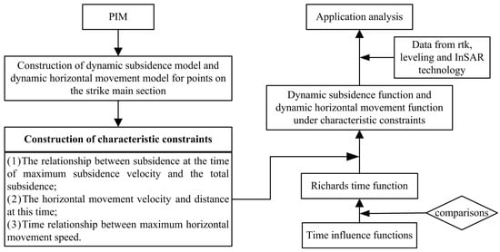 Our investigation focuses on the deformation of ground points on the strike main section from two perspectives: dynamic subsidence and dynamic horizontal movement. We have developed prediction models for dynamic subsidence and dynamic horizontal movement at any point on the strike main section. These models leverage the PIM and take into account the features of surface deformation. Characteristic constraints derived from these prediction models are subsequently used to govern the time influence function. The experimental process outlined in this article is illustrated in Figure 2.