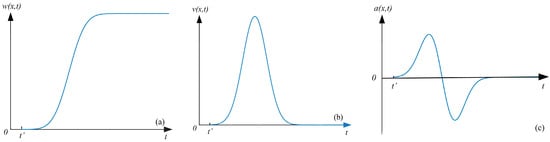 where represents the maximum subsidence and x0 is the advance distance of the working face at the starting time of surface point x. Equation (7) functions as the dynamic subsidence prediction model for any points along the strike line, providing a comprehensive description of the temporal evolution of subsidence at these specific locations. The fundamental curves of subsidence, velocity, and acceleration are depicted in Figure 3.