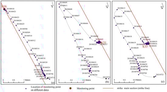 When estimating vertical deformation using the LOS deformation derived from InSAR, several researchers argue that the vertical deformation resulting from coal mining significantly surpasses the horizontal movement [27,28]. Consequently, they often overlook the influence of horizontal movement on LOS deformation. The subsidence is directly obtained by dividing the LOS deformation by () where is the radar incidence angle. The coefficient of horizontal movement in mining regions under typical geological conditions in China typically lies between 0.1 and 0.4 [37]. While the central portion of the subsidence basin, when the surface is stable, is generally assumed to experience negligible horizontal movement, other areas affected by subsidence exhibit varying degrees of horizontal movement. Furthermore, since surface deformation is a dynamic process, notable horizontal movements can occur in the central region of the basin at during specific time periods. Hence, relying on LOS directional time series deformation data that neglects the influence of horizontal movement when estimating the parameters of the time influence function can introduce inaccuracies. Consequently, an analysis of the horizontal movement within the subsidence area is crucial. The 12,401 working face of the Shangwan Coal Mine features an almost horizontal coal seam. We have set up two observation lines with 81 monitoring points on the main sections. The strike main section, also referred to as the strike line, represents the central line of the rectangular working face, extending in the direction of advancement, as shown in Figure 5. Using monitoring points 16, 31, and 33 as representative examples, we analyzed the horizontal movement of the points on the strike main section. Figure 5 displays the historical movement traces of the three monitoring points.