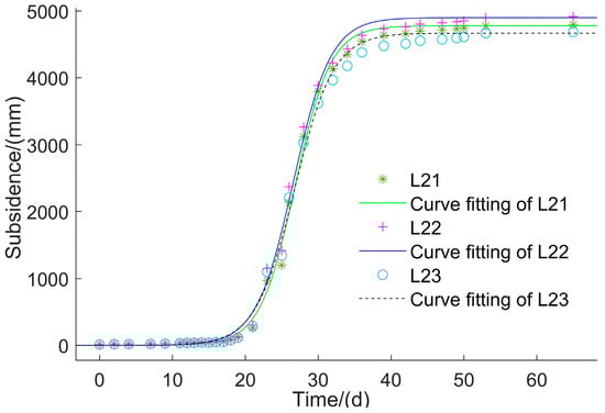 The study concentrates on the vicinity of the open-off cut of the 12,401 working face at Shangwan Coal Mine. This working face has a ground elevation ranging from 1188 m to 1300 m and a floor elevation between 1043 m and 1066 m. The dimensions of the working face are approximately 5000 m × 300 m. The depth at which mining takes place varies from 150 m to 250 m. The coal seam has an average thickness of 9 m with a planned mining height of 8.6 m and a dip angle of 1–5° [39]. The 12,401 working face is designed to progress at a rate of approximately 13 m/day. Points situated along the dip line consistently experience the effects of this advancing speed. Consequently, measured data from points L21, L22, and L23, which are in proximity to the fully mined region of the strike line (with surface subsidence during the decline phase monitored using InSAR technology), are employed to determine the parameters of the Richards model with additional constraints. As illustrated in Figure 8, the average values for parameters b1 and b2 are –24,420 and 0.3774, respectively. The model demonstrates an impressive average accuracy (R2) of 0.997, a root mean square error (RMSE) of 94.6 mm, and a relative mean square error of 1.9%. It is essential to highlight that parameter b2, as a power exponent, primarily dictates the trajectory of surface points along the time axis. In contrast, parameter b1 does not substantially alter the curve’s shape but mainly establishes its position on the time axis. The dynamic subsidence of points on the dip line is uniformly influenced by the mining advancement speed. Both the start and finish times should be consistent, with the commencement time anchored to the starting time of the dip line’s midpoint.