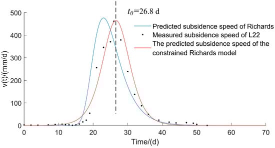 The parameters derived from fitting points L21, L22, and L23 are subsequently integrated into Equation (15). The resulting times with peak subsidence speeds are 26.9 d, 26.6 d, and 26.7 d, closely aligning with the observed time of 27 d. The accompanying subsidence amounts to half of the subsidence at these junctures. In parallel, the time the Richards model forecasts for the peak subsidence speed is 23 d. This is linked with a subsidence of 1.805 m, marking a difference of 0.649 m when compared to the actual subsidence of 2.451 m at that moment. Figure 9 illustrates the comparison between the predicted subsidence velocity and the actual subsidence velocity, as calculated by the Richards model for point L22, both before and after the incorporation of constraints.