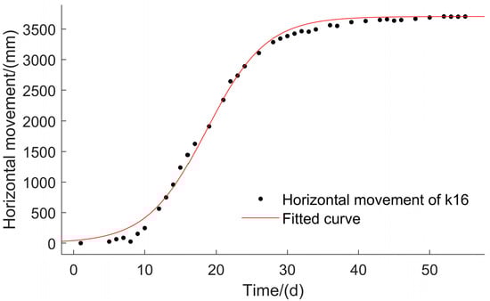The horizontal displacement of surface points is a complex process that exhibits variations over both time and space. Within the region where x ≤ D, the surface points situated on the strike line consistently face the goaf, with their movement speed transitioning from 0 → → 0. Point K16, situated close to the open-off cut, experiences the highest horizontal movement among all monitored points. The dynamic horizontal movement of this particular point is modeled using the logistic function and the corresponding graph is depicted in Figure 11.
